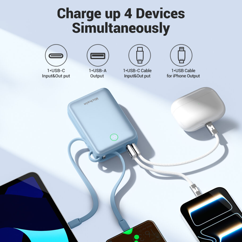 - Charge 4 Devices at Once: Never run out of power, whether you need charge smartphones, tablets, or other USB-enabled devices. Connect up to 4 at once thanks to a USB-C Cable, a Lightening Cable, a USB-A port, and a USB-C port,Charging more efficiently. Four-port design for the 20000mah power bank allows you to share portable power with families and friends.